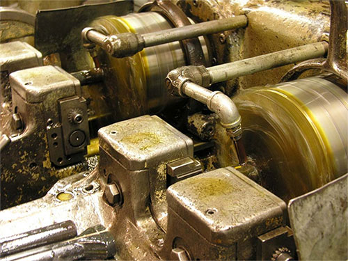 A stamping machine is used to press patterns or designs onto metal bolts, creating precise impressions on their surface.